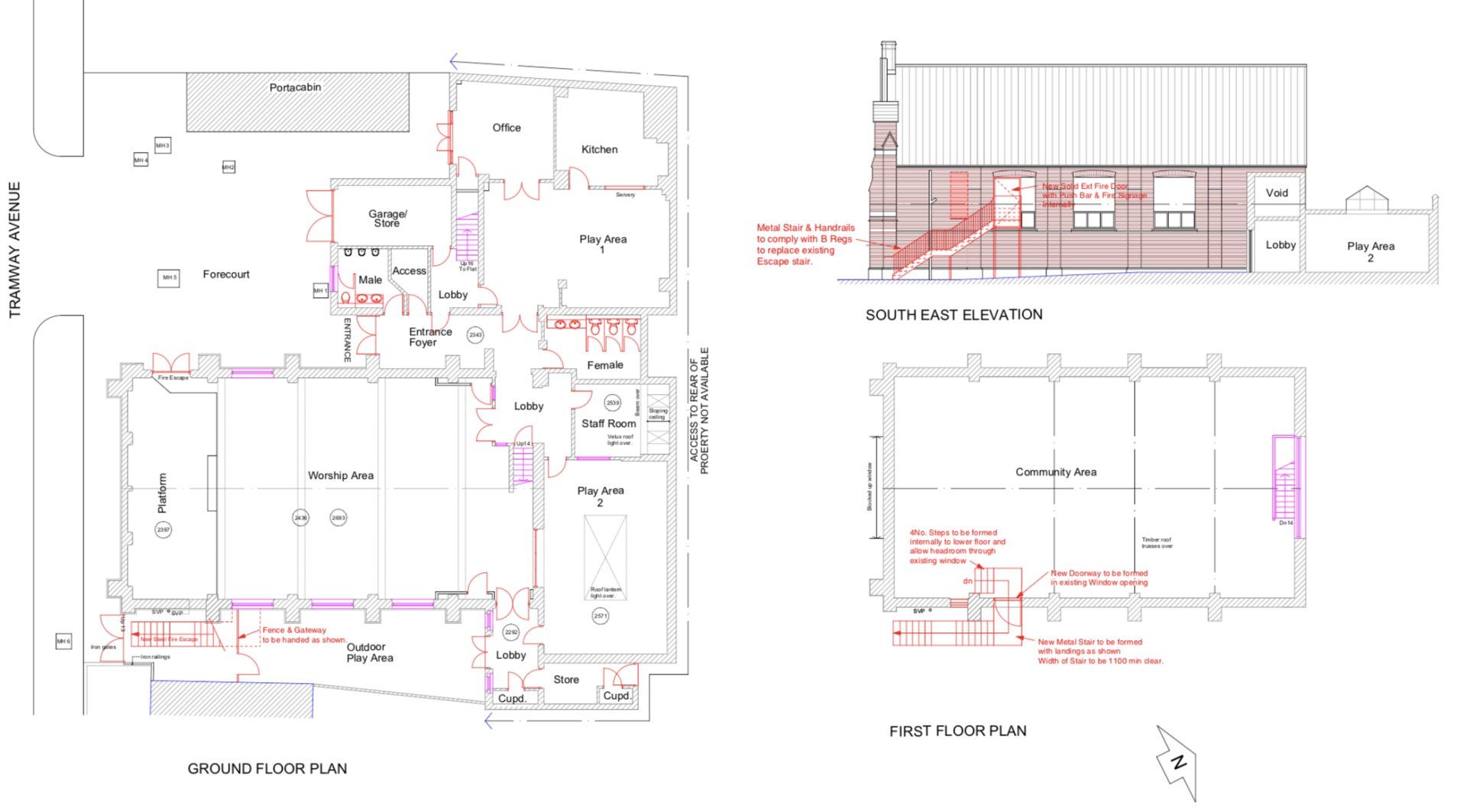 The rear fire exit area was excavated, the astro-turf in the rear garden was taken up and fencing erected to protect the children's play area. Ground floor partition and ground floor and 1st floor electrical wiring of the main lights and some floor boxes.