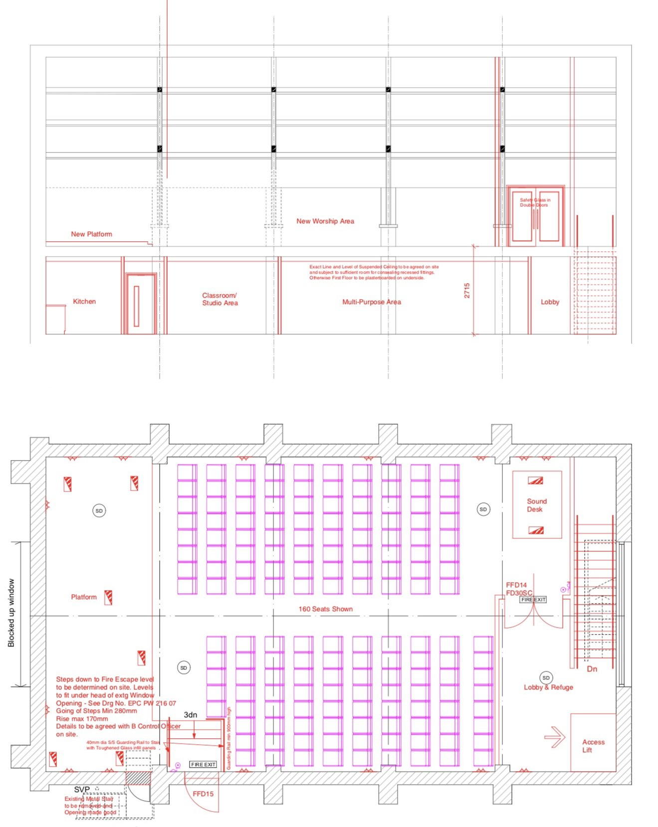 All glass work completed and ground floor double doors hanged. Rear fire escape delivered and secured in location.