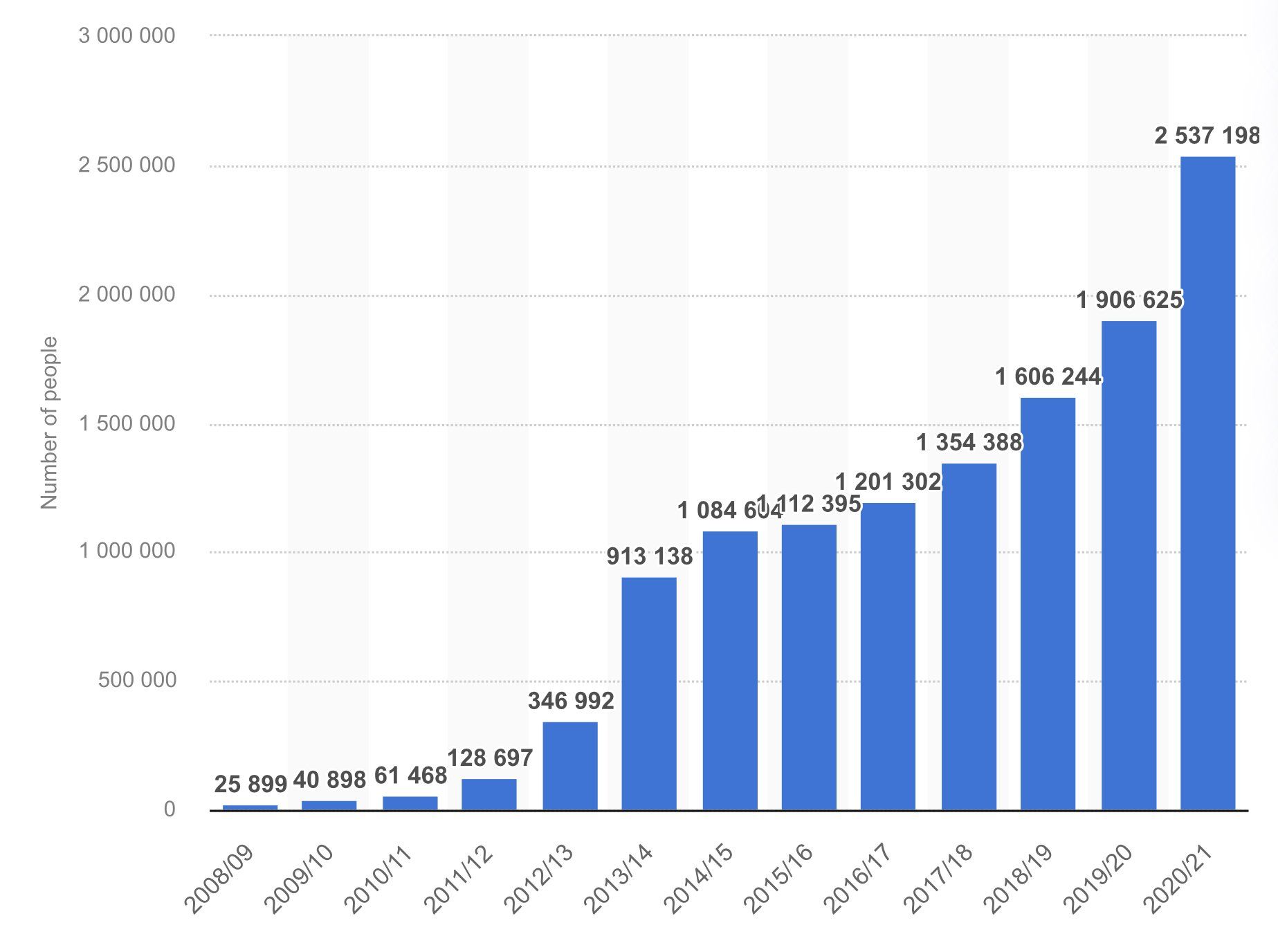 Number of people receiving three days' worth of emergency food by Trussell Trust foodbanks in the United Kingdom from 2008/09 to 2020/21